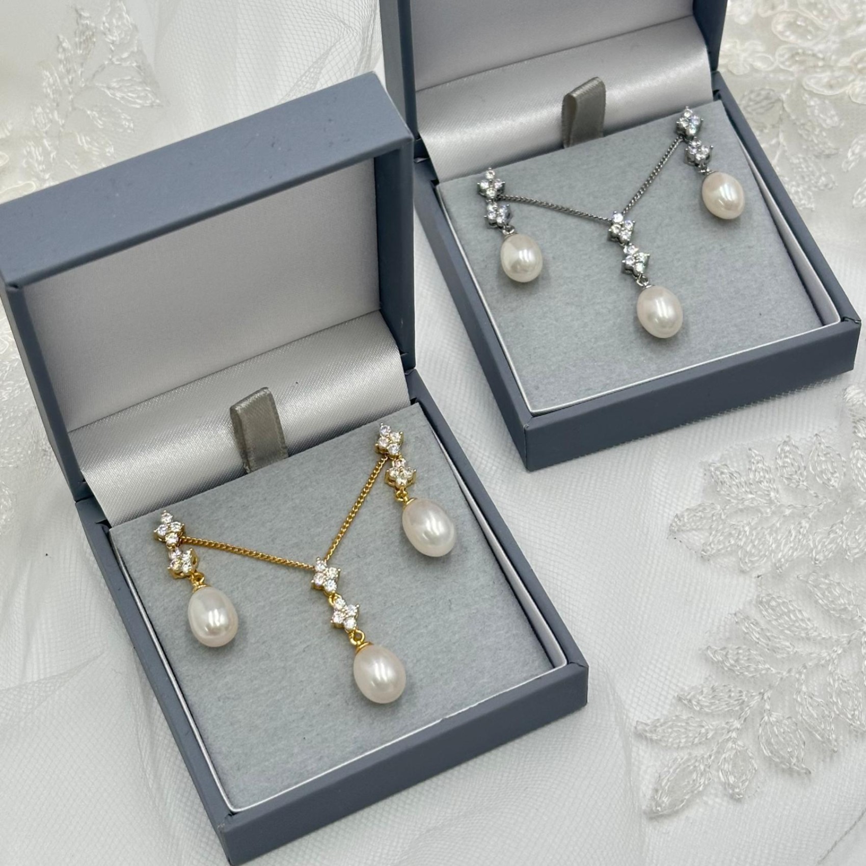 This delicate duo features a drop necklace and matching earrings, each adorned with shimmering floral-clustered crystals and a lustrous, teardrop-shaped freshwater-style pearl. The Beth set adds a sophisticated, feminine touch to any bridal or evening ensemble.