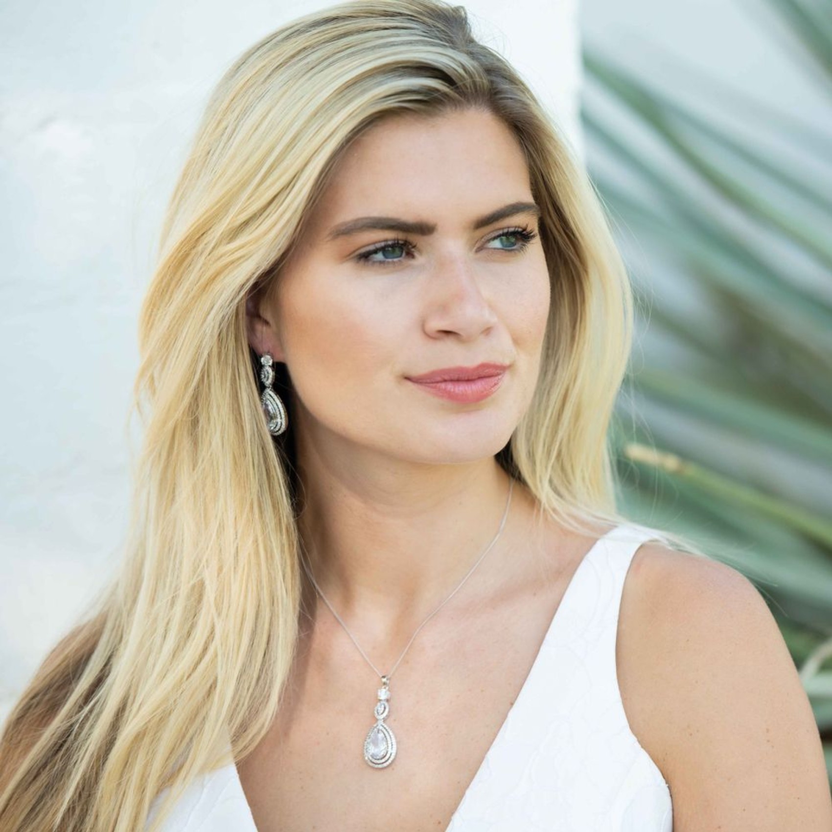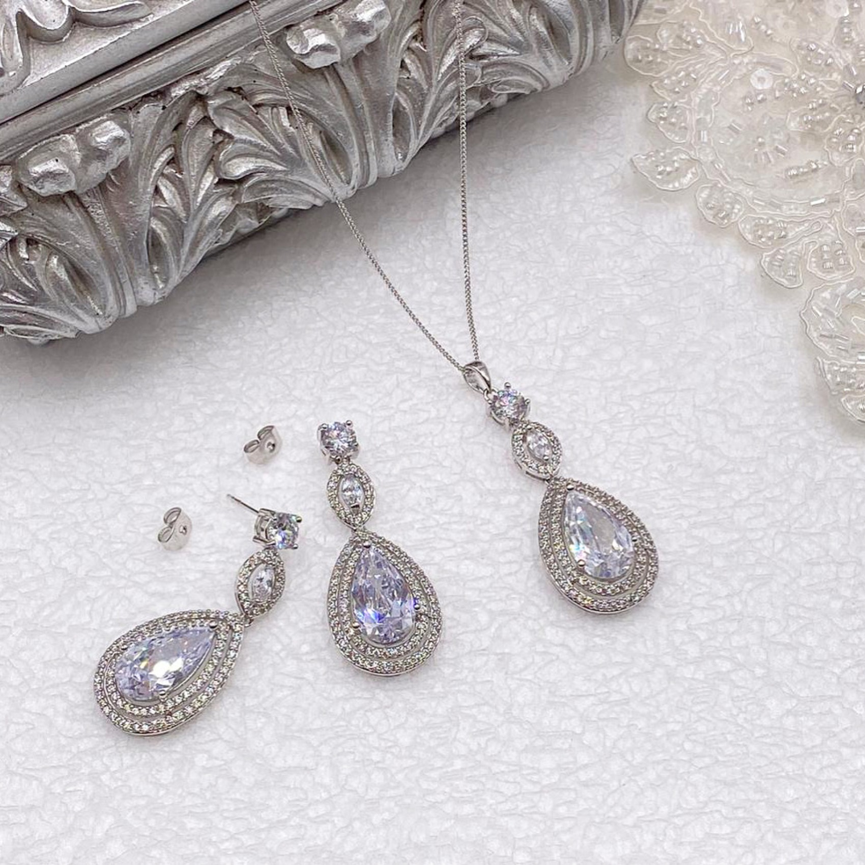 Add glamour and sparkle to your look with this stunning crystal jewellery set by Ivory and Co. A twinkling solitaire crystal suspends a double diadem drop, featuring a large teardrop stone trimmed with a double row of tiny pave set crystals. With echoes of decadent jewellery of the 1920's, this statement set is perfect a vintage bridal look.