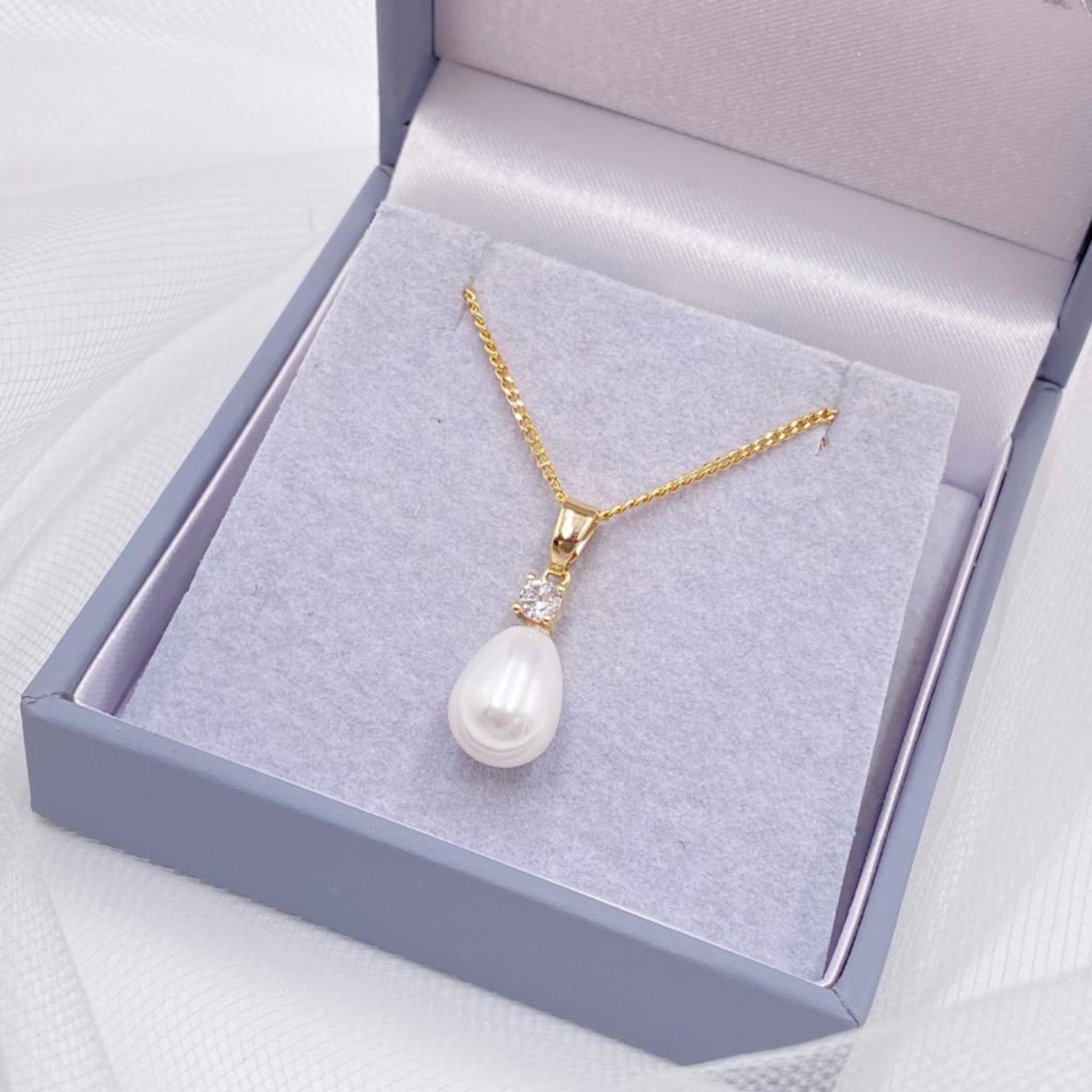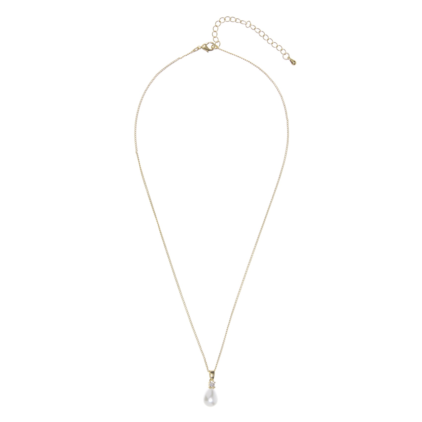 A classic gold pendant necklace featuring a gleaming ivory teardrop pearl beneath a single twinkling solitaire crystal. This dainty pearl pedant necklace is a pretty choice for brides and bridesmaid alike.