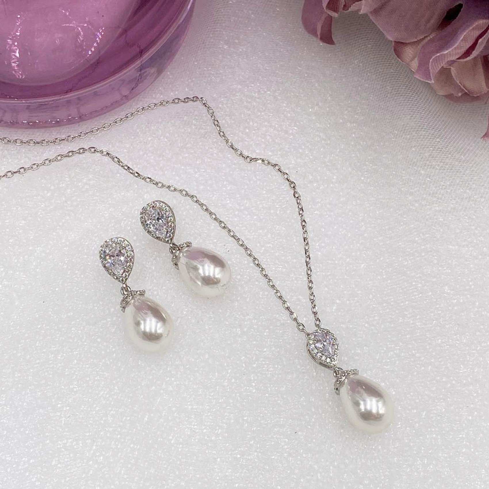 Every bride loves Paloma! A timeless and elegantly styled pearl bridal pendant necklace crafted with clear cubic zirconia crystals and a shimmering ivory teardrop pearl. This beautiful pearl pendant necklace is perfect for any bridal look.