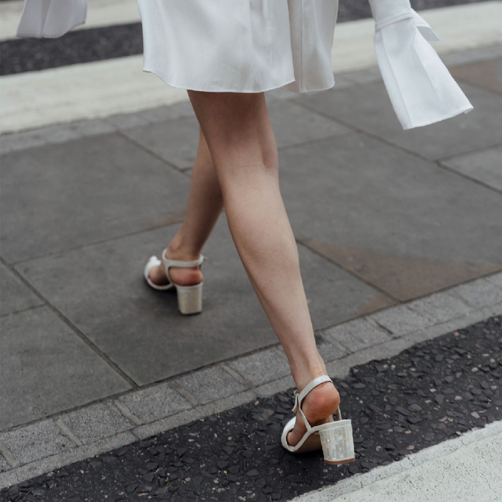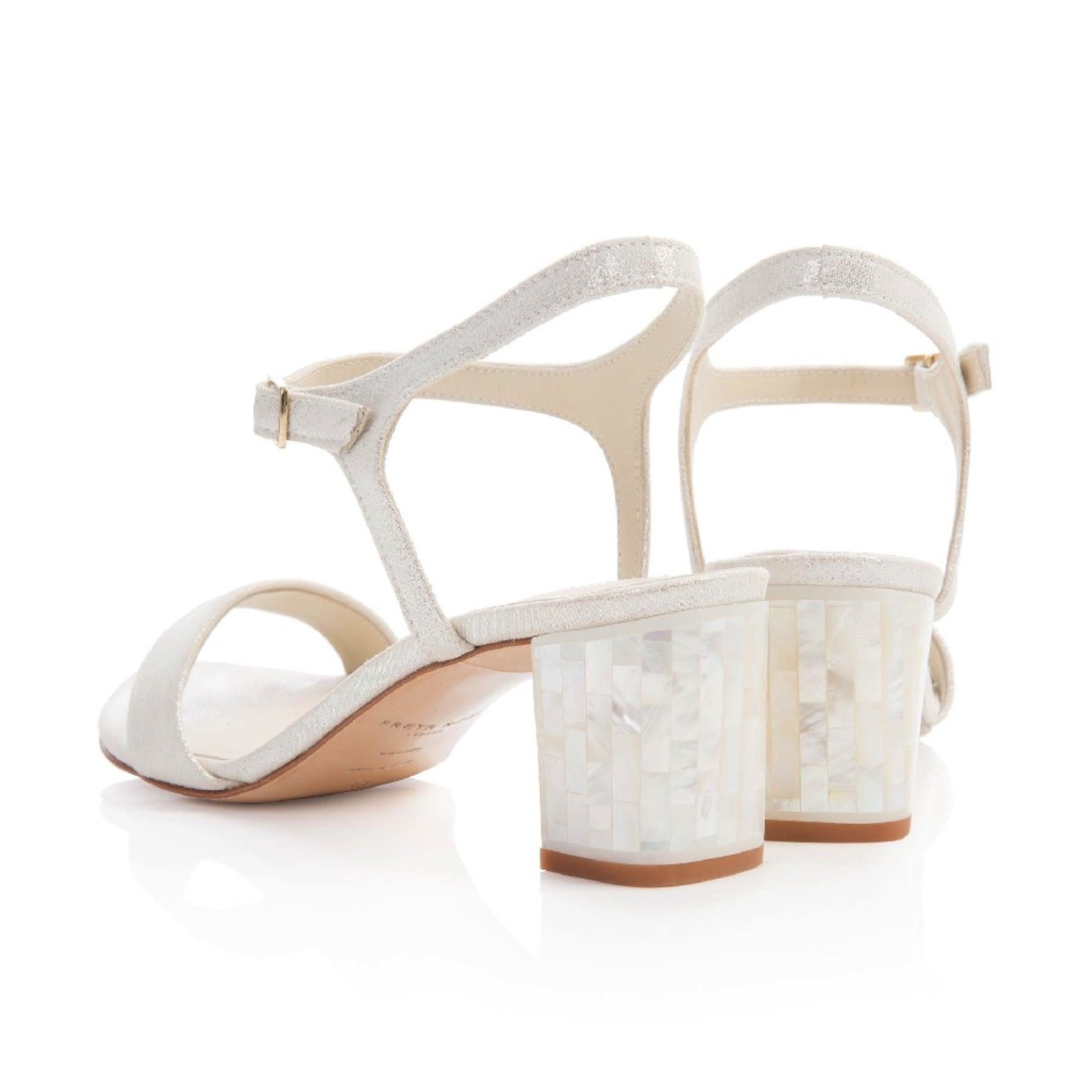 A chic mid heel peep toe sandal made with shimmering ivory suede, these beautiful shoes feature Freya Rose's signature Mother of Pearl block heel, making them truly special. This elegant design also features a dainty ankle strap for extra style and comfort. A fabulous block heel sandal, perfect for any special occasion.The perfectly proportioned silhouette with a special memory foam lining is designed to keep you comfortable until the early hours.