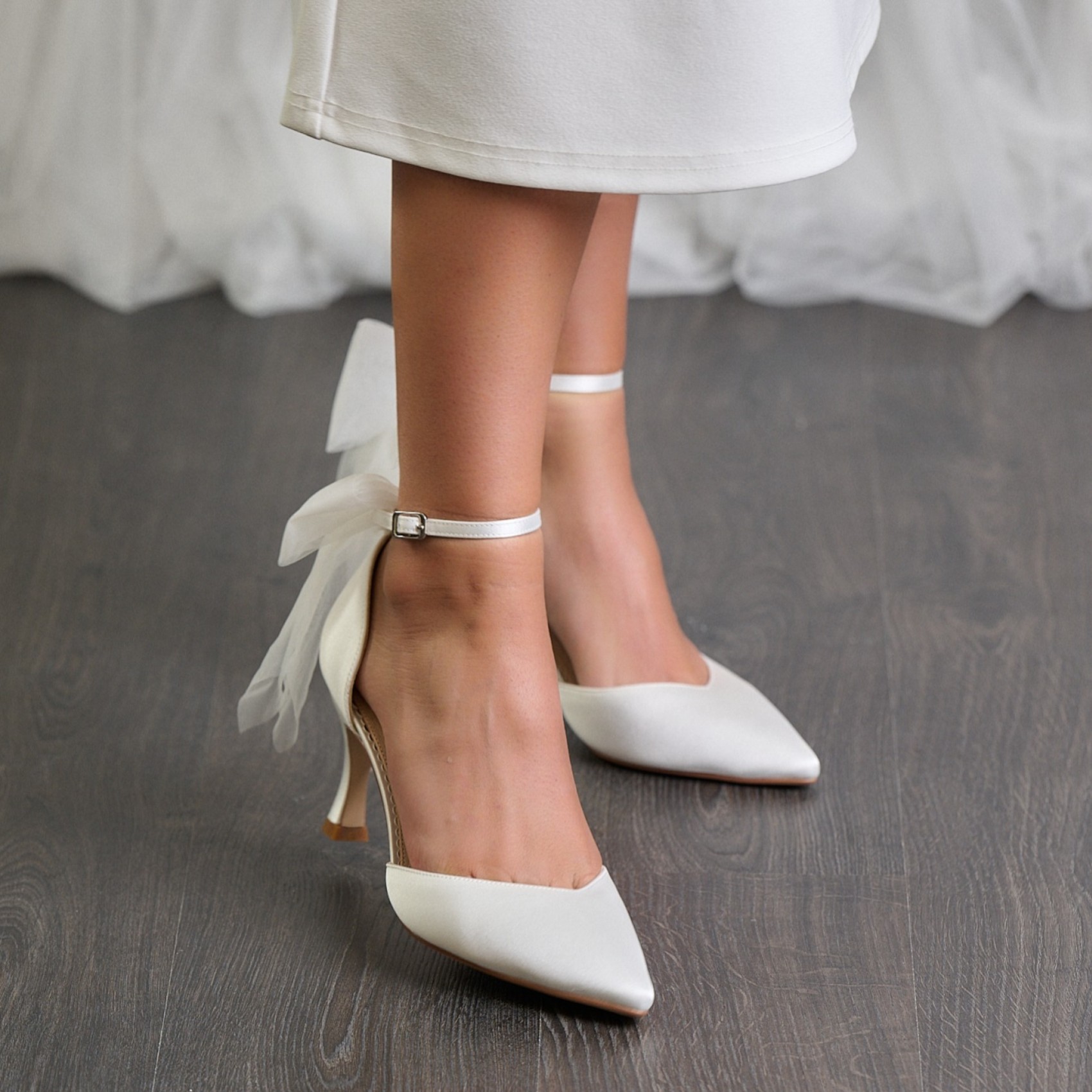 Fun, feminine and rather fabulous, our Mathilda bow court shoes are a playful new design, exclusive to Lace & Favour. These statement bridal shoes are crafted from luxurious ivory satin, have a pointed toe, sleek ankle strap and a contemporary tapered heel adorned with a romantic tulle bow. Brides with shorter wedding dresses will love these stylish wedding shoes - it's an impactful, unforgettable style!