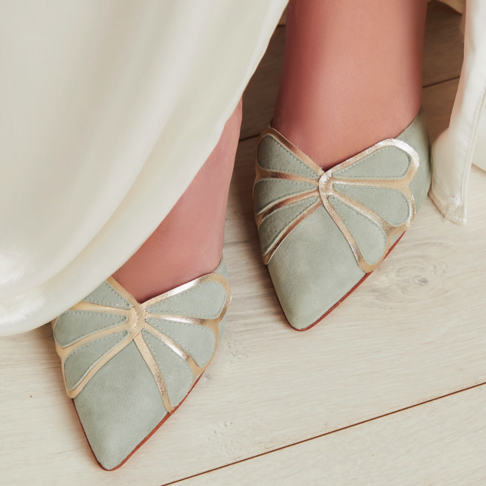 An elegant two part court shoe beautifully handcrafted in gorgeous mint suede with contrasting gold metallic Art Deco inspired details. Sitting on a mid heel, with a leather insole and lining, these Rachel Simpson shoes provide wear-all-day comfort as well as unique, luxe styling.