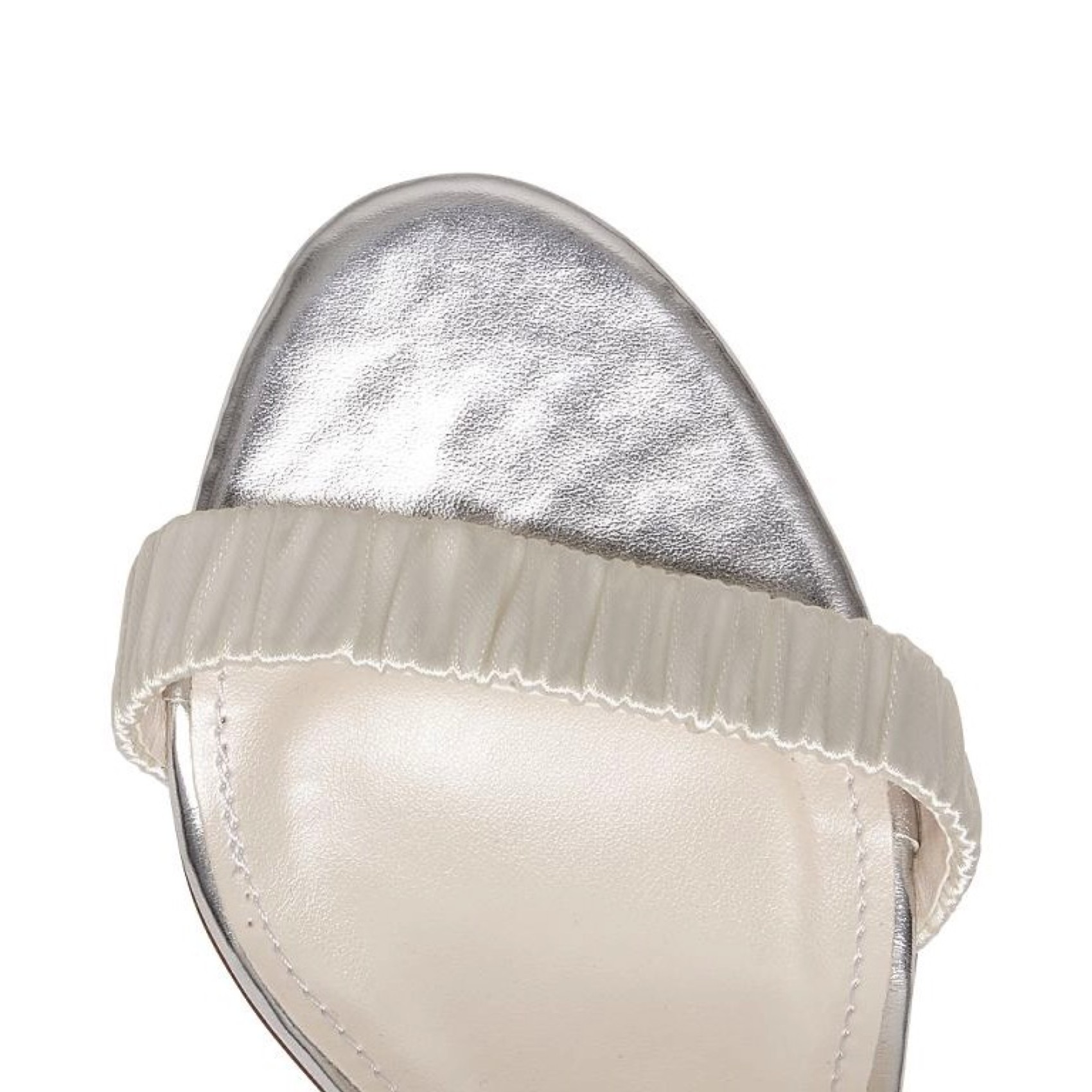 A simple wedding shoe designed with the option to accessorise, the Lois bridal sandals are a new style in our collection. Crafted from classic ivory satin, which can be dyed to a colour of your choice, they have a single ruched strap over the toes, silver leather detailing to the insole, a closed back of heel, a plain ankle strap, and a high block heel.