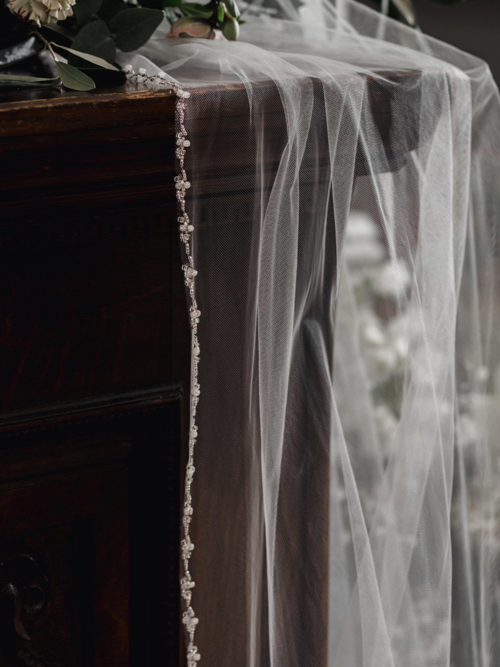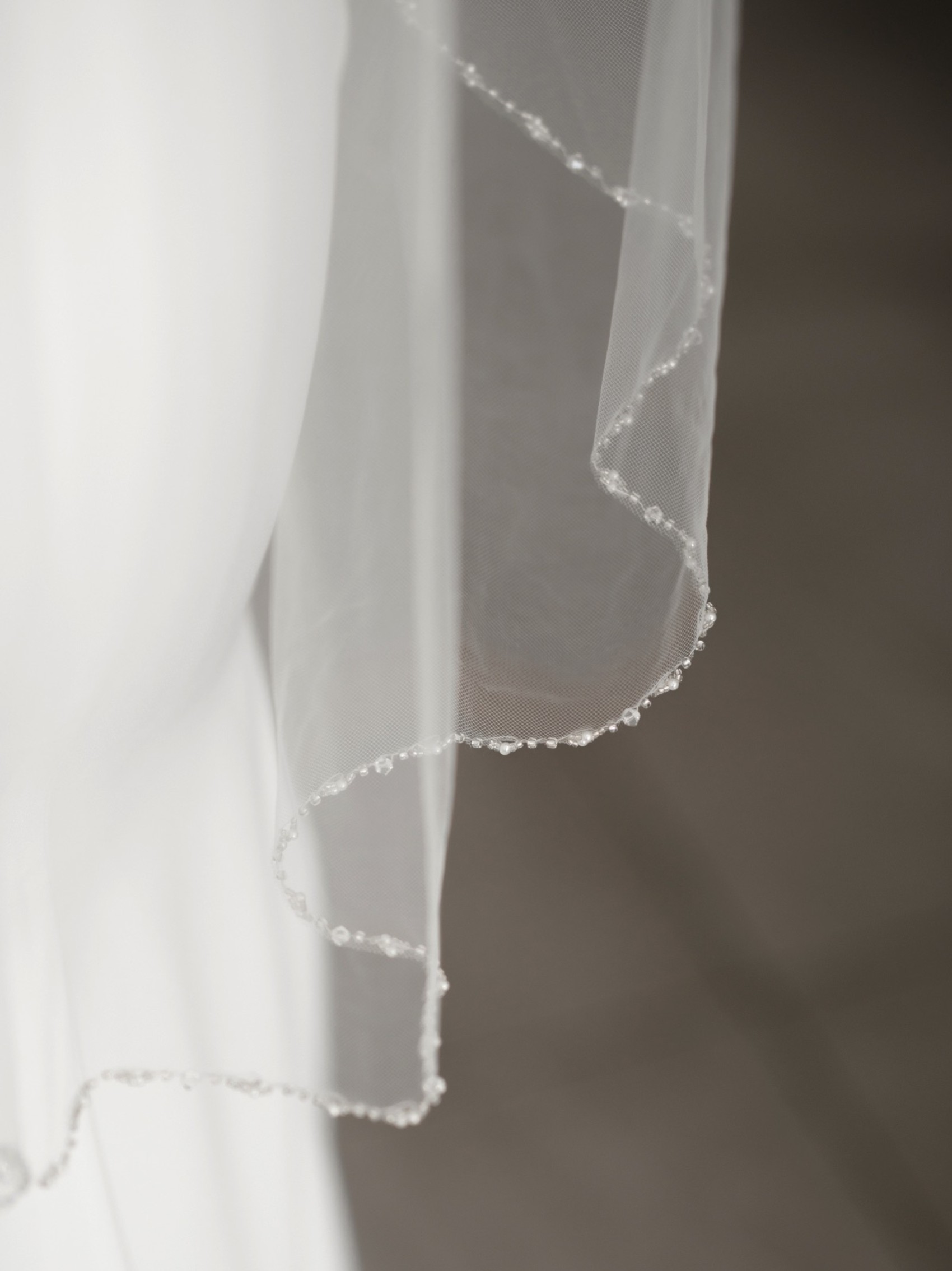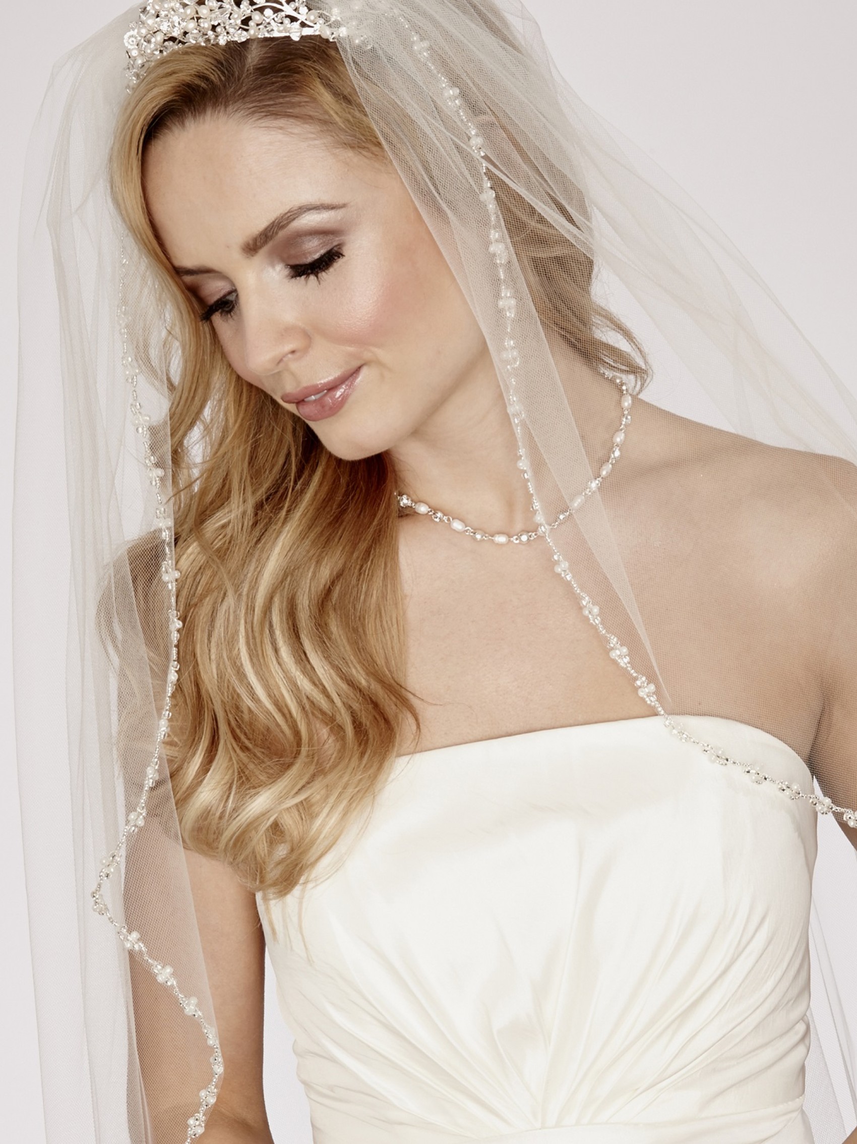 A beautiful single tier veil edged with dainty ivory pearls and bugle beads. A gorgeous addition to a classic bridal look this pretty wedding veil by Linzi Jay is available in 2 different lengths to suit your attire perfectly.