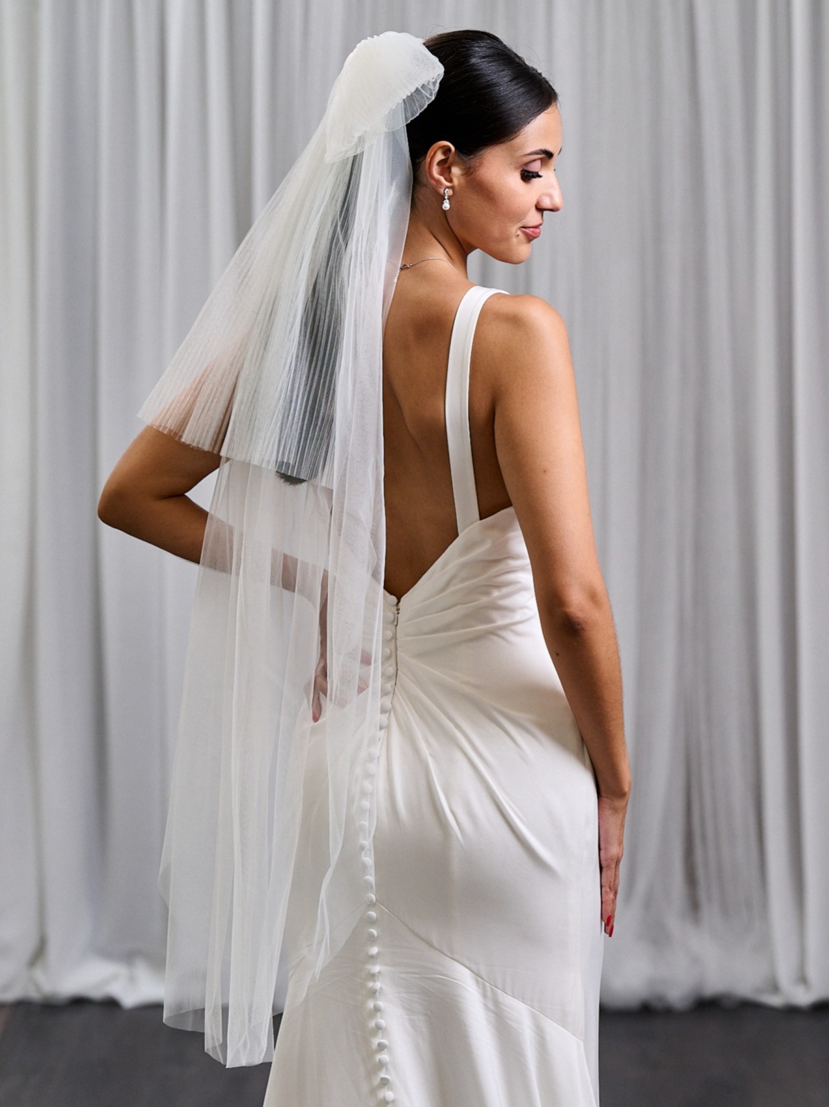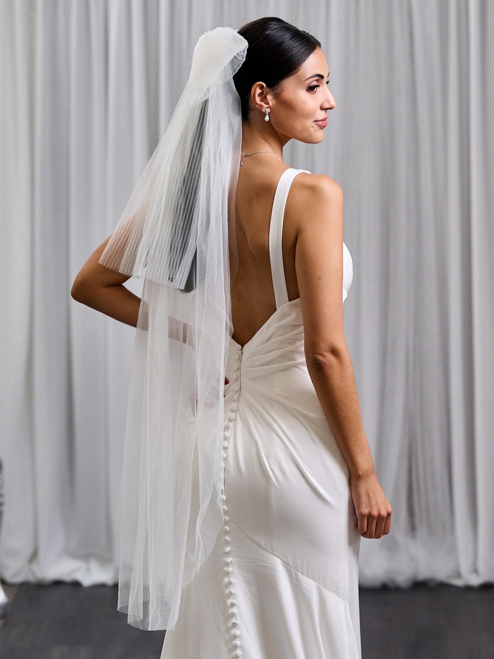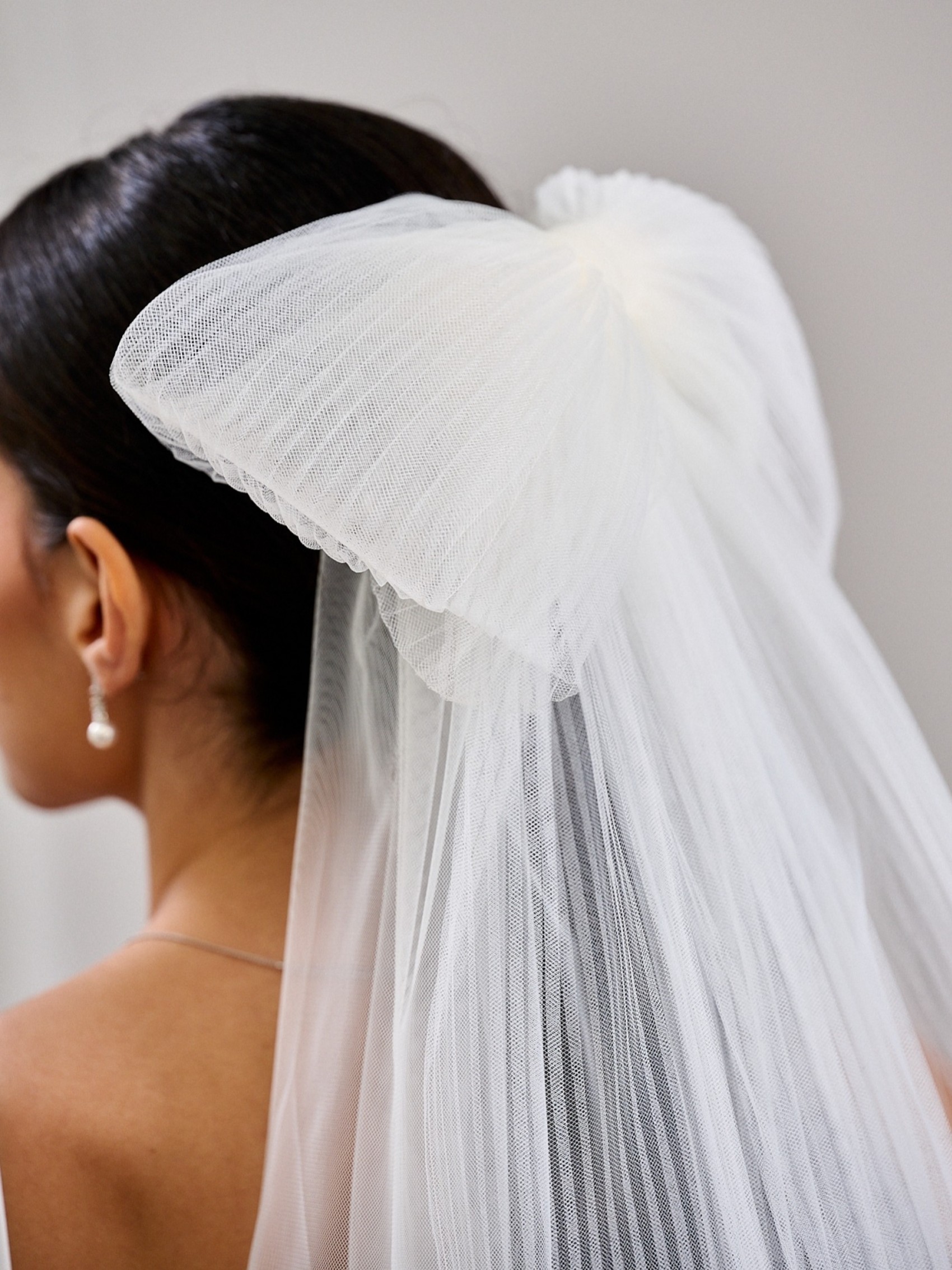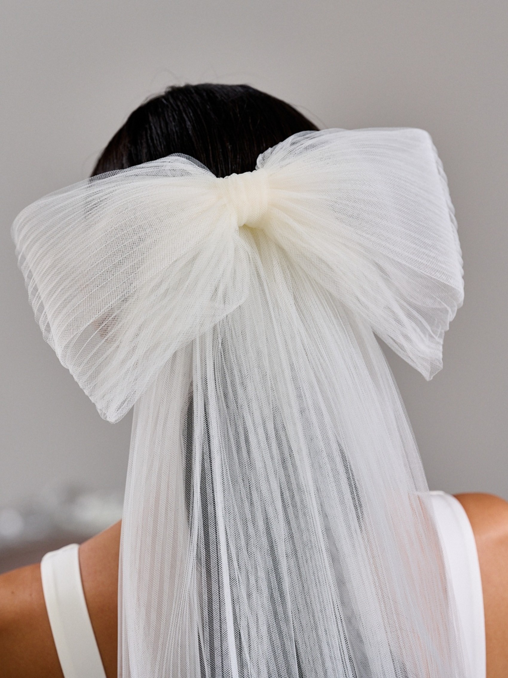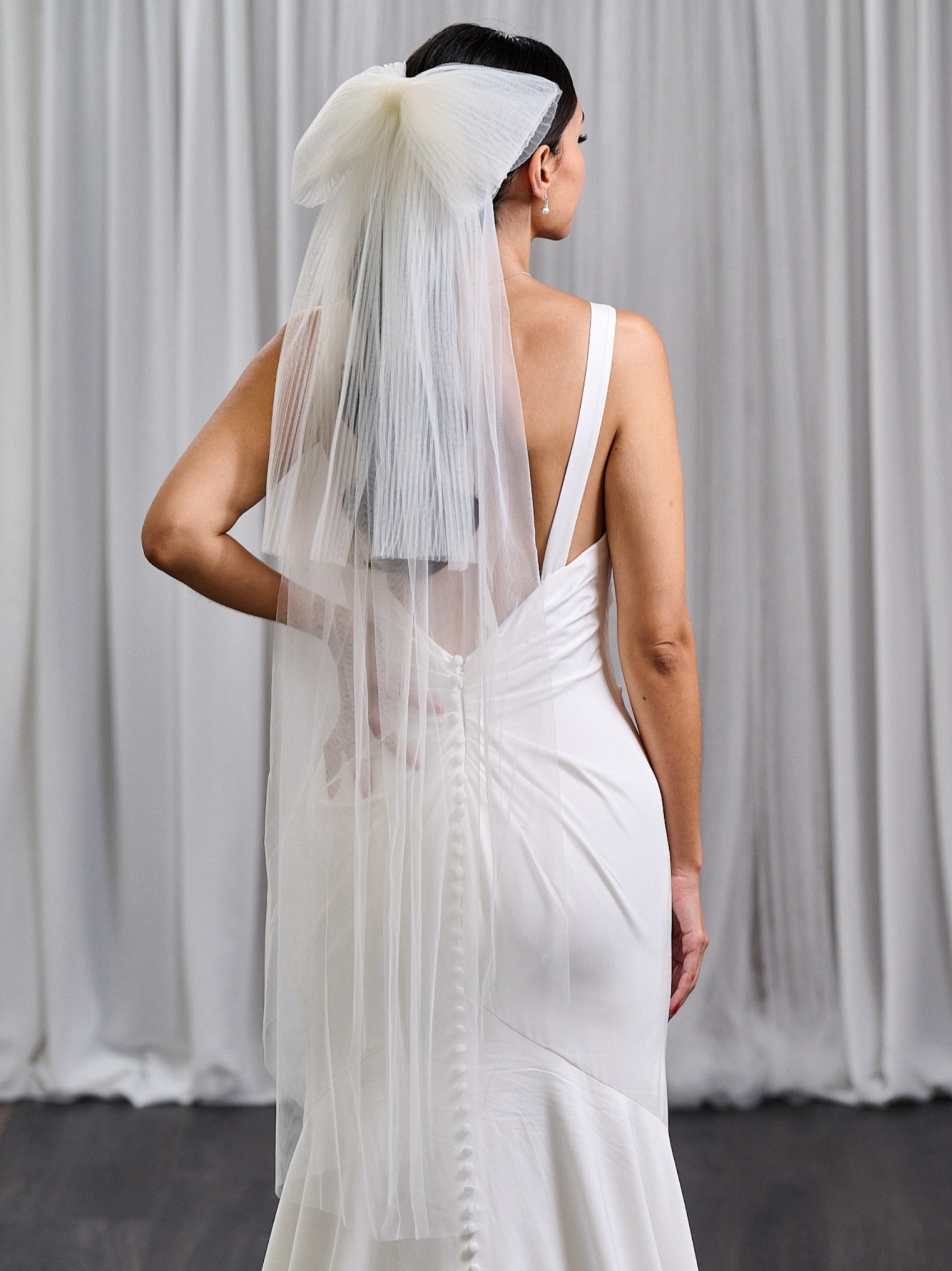 Playful and chic, this short bow veil is the perfect finishing touch for the modern bride. Crafted from ivory plisse tulle, it features an oversized bow that sits effortlessly at the back, adding a hint of whimsy and romance. Its cropped length offers a fresh, contemporary twist on the classic veil, making it ideal for civil ceremonies, receptions, or a fun second-look moment.