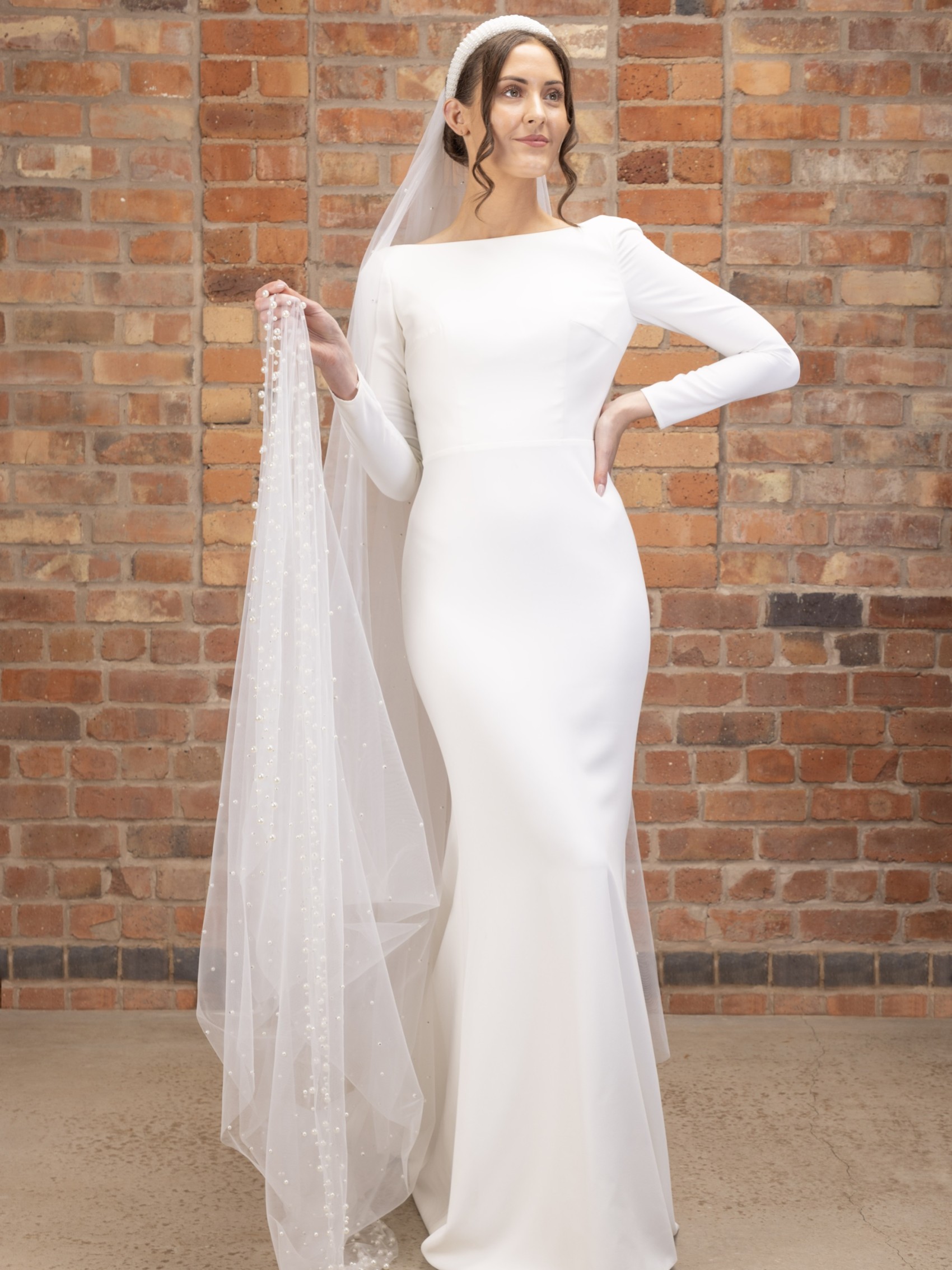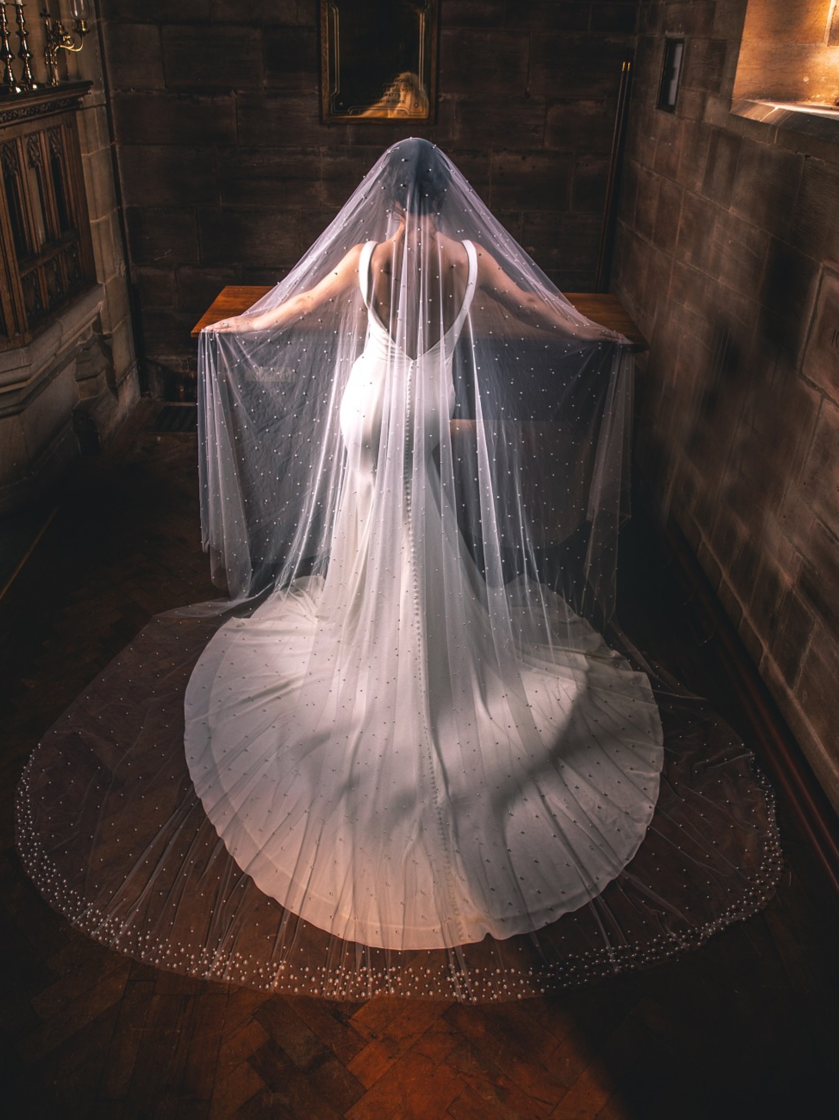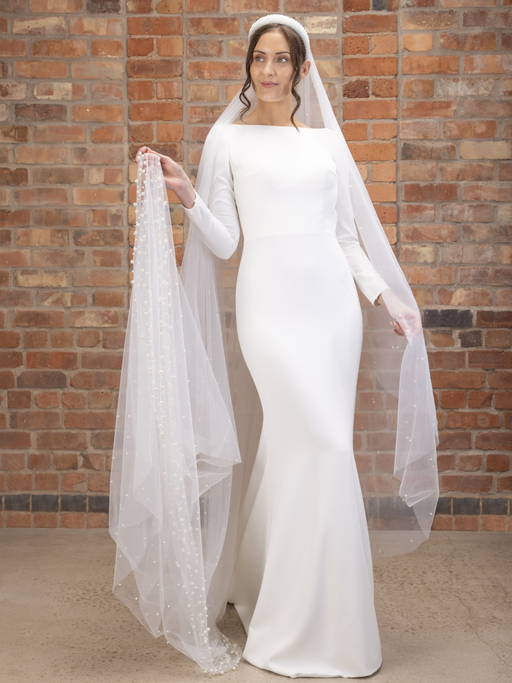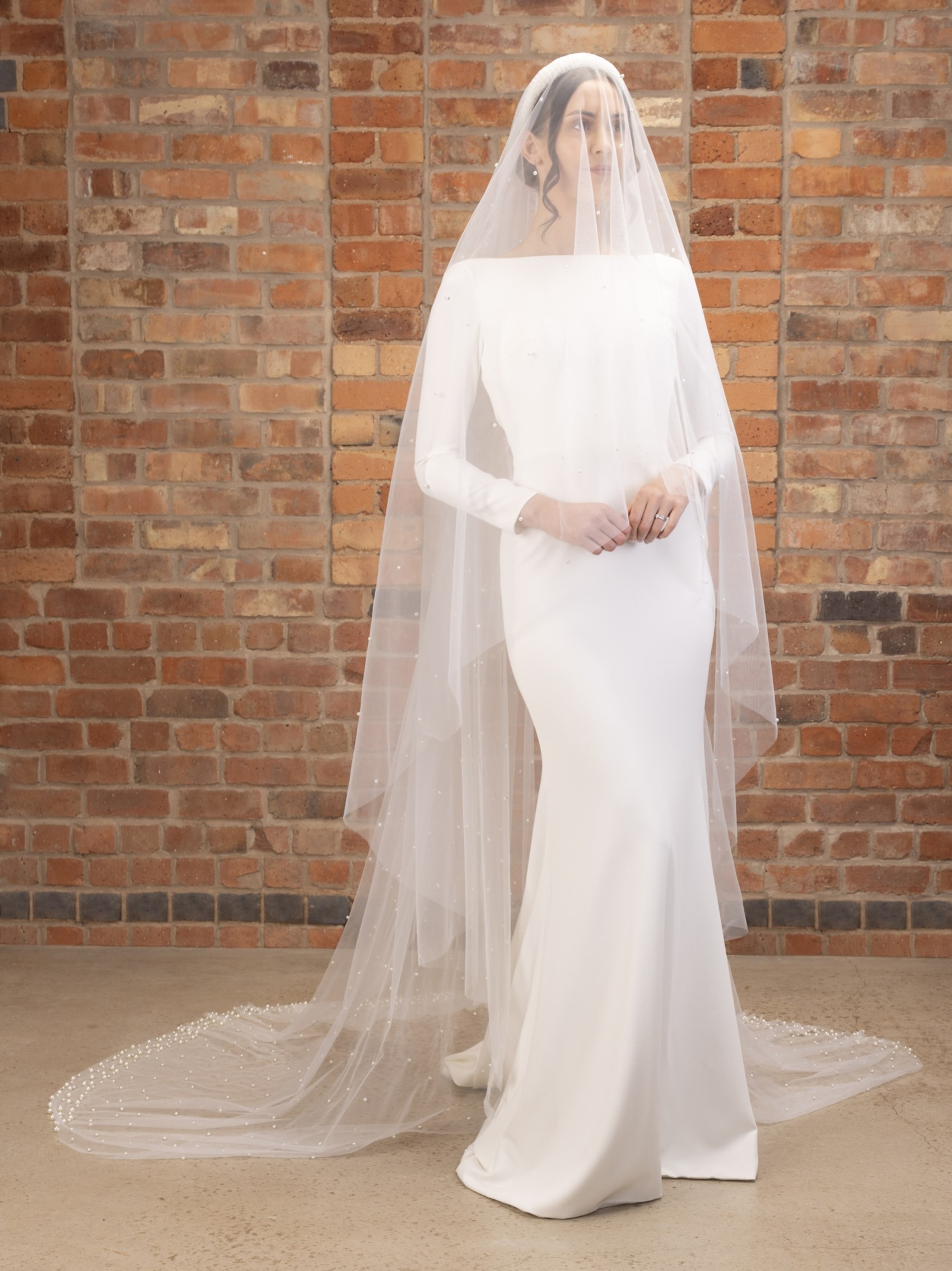 Make a dramatic entrance on your big day with this show-stopping pearl cathedral veil. Handcrafted from two layers of dreamily soft ivory tulle this veil is adorned with hundreds of luminous ivory pearls and finished with a heavily embellished border at the train. This beauty is definitely not for the faint-hearted!